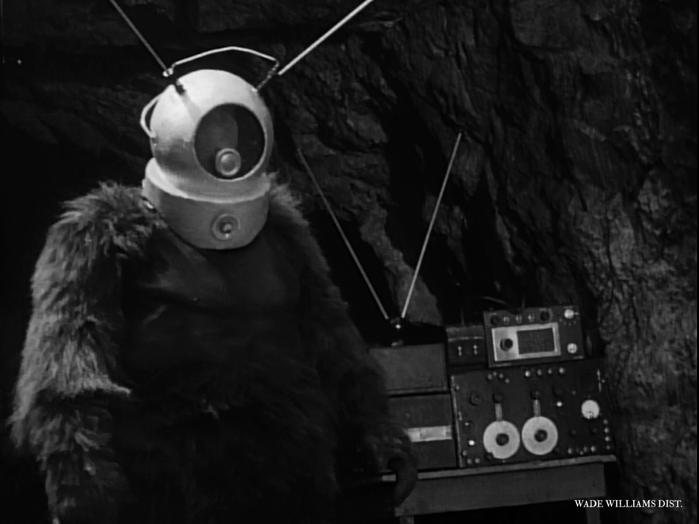 The Ro-Men “diving helmets” are of course very similar to other spaceman helmets of the era, such as those seen in Destination Moon (1950) and Radar Men from the Moon(1952). (This brings to mind one of Robot Monster’s alternate titles, Monsters from the Moon.) But most importantly, Medved referred to a single helmet, and Barrows continued in that vein, never remembering plural helmets. This implies that both Ro-Men were perhaps portrayed with the same helmet along with the same gorilla suit, despite some cosmetic differences in the look of each. Great Guidance’s helmet has some kind of suction cup attachments in place of Earth Ro-Man’s more traditional antennae, and lacks the front disc and gear attached to the back. Most notably, Guidance’s helmet is dented on the left edge of its opening. The Guidance helmet could have been a re-dress of the same helmet or (less likely because it would have meant more trouble) a hastily made second helmet. But in any case, it is unfortunate that Guidance has the dented helmet, because the damage would have been a good externalization of Earth Ro-Man’s unbalanced nature. The more perfectly un-dented, round opening of Earth Ro-Man’s helmet would have better presented the unsympathetic and unyielding nature of Guidance and the tight, closed, circular logic of “the Plan.”
